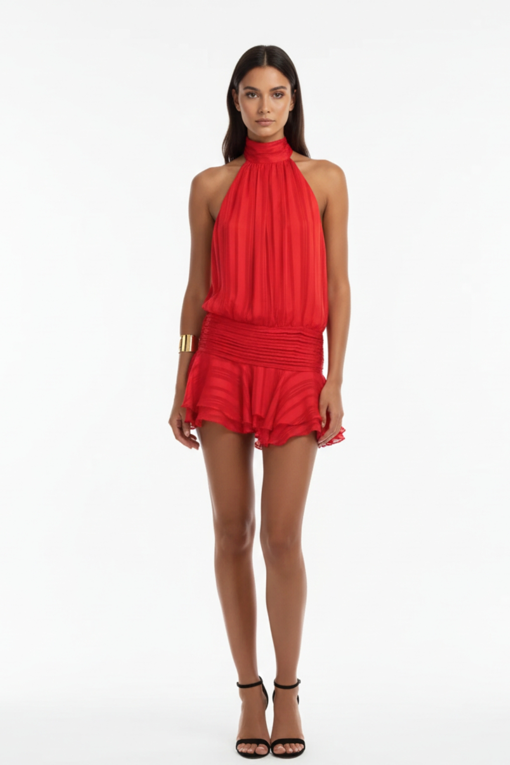 Add a touch of elegance to your warm-weather wardrobe with this Women’s Halter Neck Dress. Crafted from a breathable woven blend of 95% polyester and 5% spandex, it features a flattering halter neckline and a relaxed H-shaped silhouette. The subtle self-design pattern adds texture and charm, making it perfect for effortless daily style during spring and summer.
